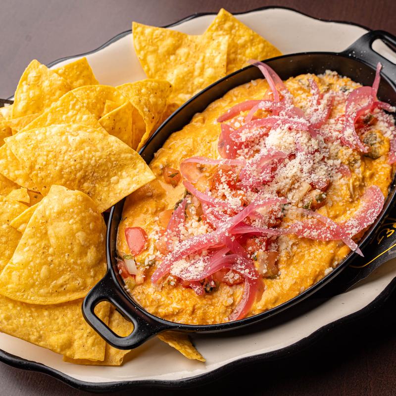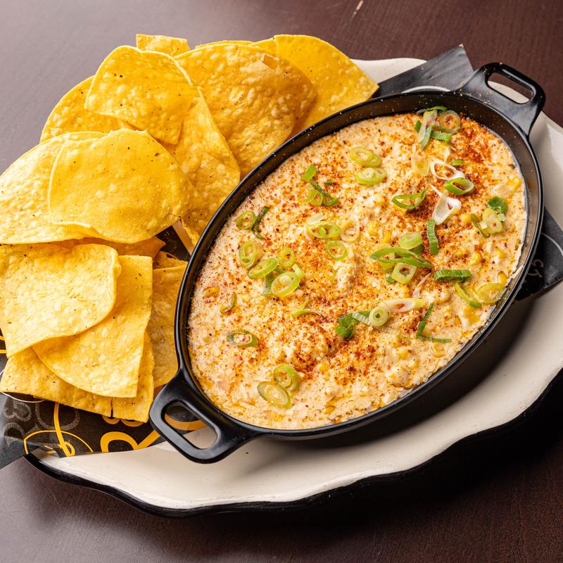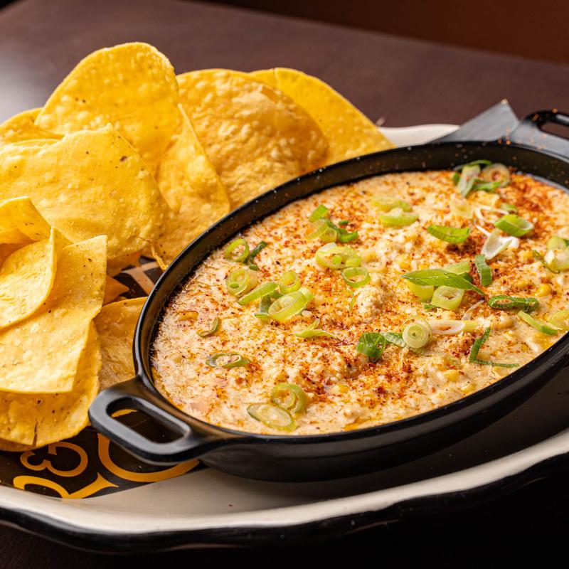 Half Tray $70.00 | Full Tray $135.00 • Fire roasted corn, r&g cheese sauce, pepper jack tajin, served with house made tortilla chips.