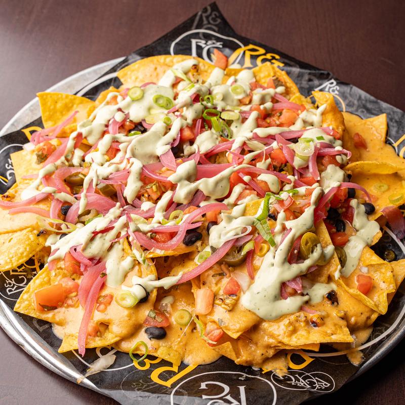 GOLD CHEESE SAUCE, SALSA, BLACK BEANS, SHAVED ONIONS, AVOCADO CREMA