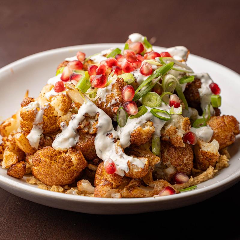 CRISPY CAULIFLOWER, BRUSSEL SPROUTS, ROASTED GARLIC HUIMMUS, CUCUMBER MINT YOGURT