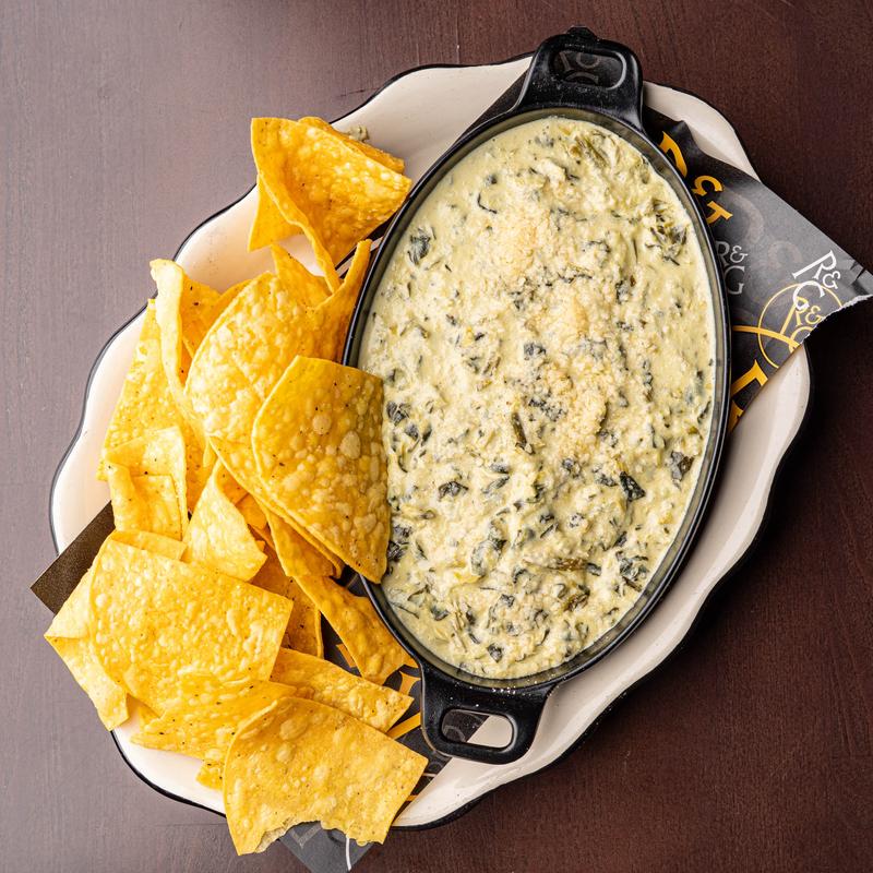 Half Tray $80.00 | Full Tray $155.00 • Artichoke hearts, chopped spinach, cream cheese blend. Served with tortilla chips.
