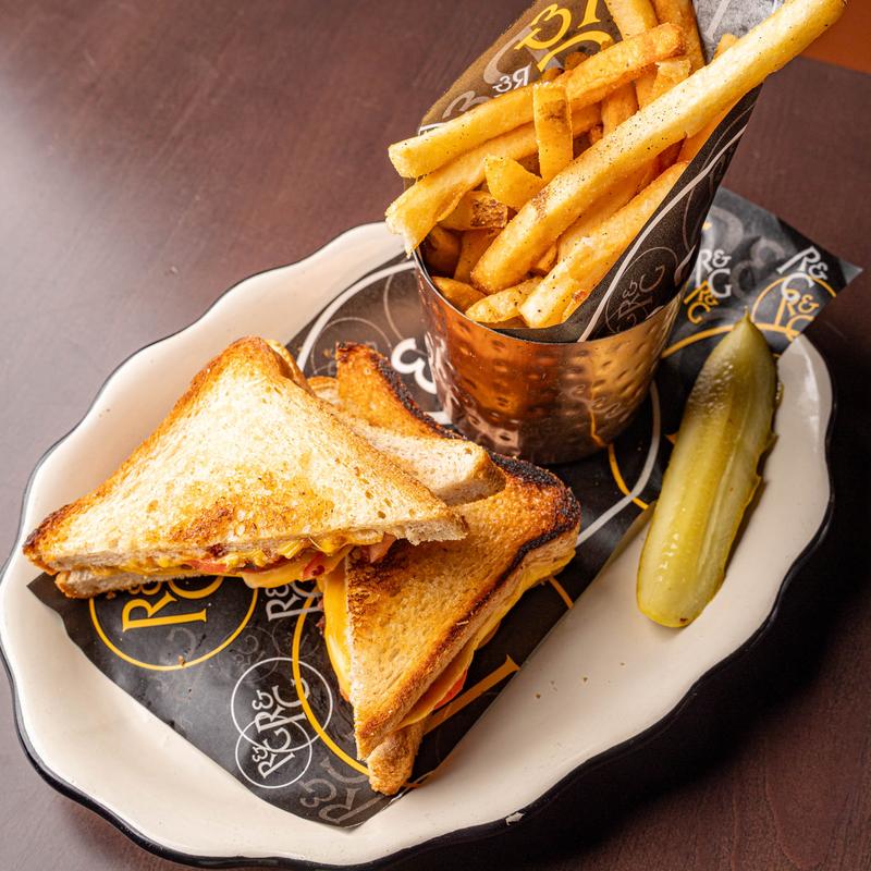 THICK CUT WHITE TOAST,AMERICAN CHEESE, BACON AND TOMATO