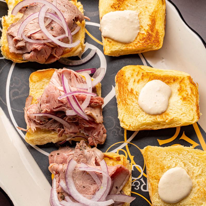 ROASTED BEEF AU JUS, LIQUID GOLD CHEESE SAUCE, ONION