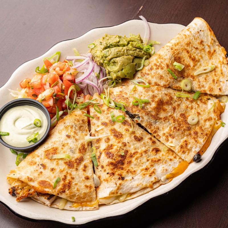 CAJUN RUBBED CHICKEN, CHEESE BLEND, BLACK BEANS, CILANTRO, AVOCADO CREMA