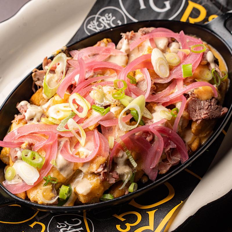 HOT SLICED ROASTED BEEF, CHEESE SAUCE, CRISPY ONIONS